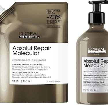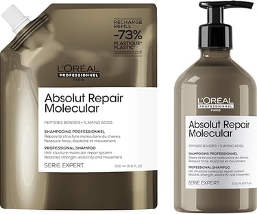 L’Oréal Professionnel Absolut Repair Molecular Shampoo & Refill Big pack bundle 1L (2x 500ml), For Extremely Damaged Hair, Molecular Bond Repair, restores strength & elasticity