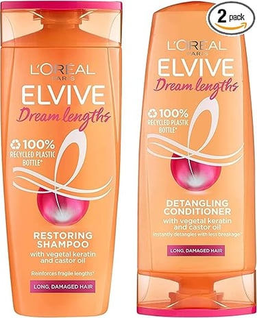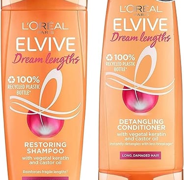 L'Oréal Elvive Dream Lengths Shampoo 250ml & Conditioner 200ml Set for Long Hair, Nourishing Repair with Castor Oil & Vitamins for Damaged Ends, Smooth & Strong Hair