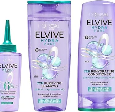 L’Oréal Paris Elvive Hydra Pure Routine for Oily Roots, Scalp & Dehydrated Lengths, Powered with Hyaluronic & Salicylic Acids, Exfoliating Pre-Shampoo Scalp Serum, Shampoo & Conditioner Set