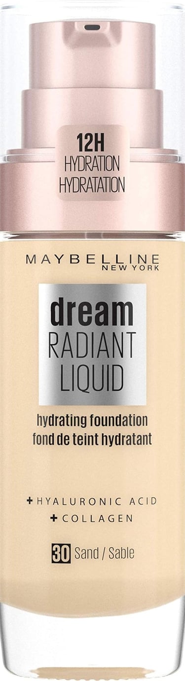 Maybelline Foundation, Dream Radiant Liquid Hydrating Foundation with Hyaluronic Acid and Collagen - Lightweight, Medium Coverage Up to 12 Hour Hydration - 30 Sand